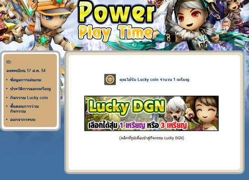 Power Play Time กิจกรรมที่ยิ่งเล่นยิ่งได้ เพียงแค่ล็อคอินอยู่ในเกมส์ Dragonica เป็นเวลา 4 ชั่วโมงขึ้นไป โดยต้องเป็นตัวละครตัวเดียวกันเท่านั้น ก็รับไปเลย เหรียญ Lucky Coin จำนวน 1 เหรียญ
