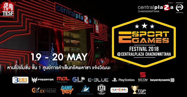 ทั้งนี้งาน Esport Games Festival 2018 @CentralPlaza Chaengwattana จัดขึ้นในวันที่ 19-20 พฤษภาคม 2561 ณ ลานโปรโมชั่น ชั้น 1 ศูนย์การค้าเซ็นทรัลพลาซา แจ้งวัฒนะ ตั้งแต่เวลา 10.00 น. เป็นต้นไป
