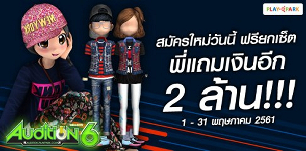 AUDITION เกมแดนซ์ออนไลน์สุดฮิตอันดับ 1 ของเมืองไทย เพียงสมัครไอดีและสร้างตัวละครใหม่ในช่วงระยะเวลากิจกรรม รับฟรีไอเทมยกเซ็ต 30 วันพิเศษ! หากเล่นได้ถึงเลเวล 6 สามารถกดรับไอเทมยกเซ็ตถาวร + เงิน 2 ล้านDEN ไปเลย!! ตั้งแต่วันนี้ – 31 พฤษภาคม 2561 รายละเอียดเพิ่มเติม (คลิกที่นี่)