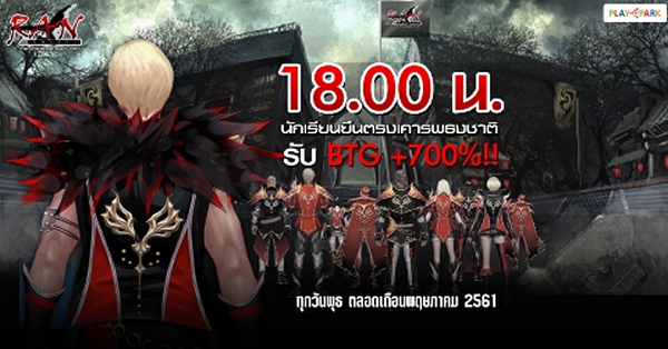 RAN Online สังเวียนเดือด ศึกสามสถาบัน ชวนทุกคนมาสนุกสุดมันส์ต้อนรับเปิดเทอม กับกิจกรรม 8.00 น. นักเรียนยืนตรงเคารพธงชาติ รับ BTG +700%!! แค่มาให้ไว ใส่ชุดนักเรียน แล้วยืนตรง เคารพธงชาติ กิจกรรมนี้มีทุกวันพุธ ตลอดเดือนพฤษภาคม 2561 ห้ามพลาด!! รายละเอียดเพิ่มเติม (คลิกที่นี่) และ กิจกรรม Daily Login ต้อนรับเปิดเทอมแจกไม่ยั้ง!! ตั้งแต่วันนี้ – 31 พฤษภาคม 2561 รายละเอียดเพิ่มเติม (คลิกที่นี่)