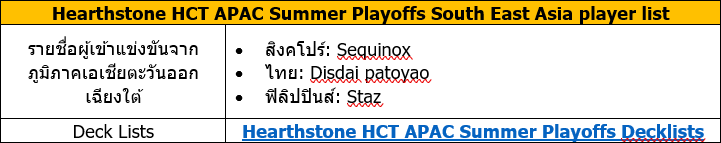 รายชื่อผู้เข้าแข่งขัน Hearthstone HCT APAC Summer Playoffs แห่งภูมิภาคเอเชียตะวันออกเฉียงใต้