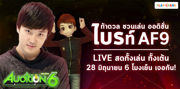 AUDITION เกมแดนซ์ออนไลน์สุดฮิตอันดับ 1 ของเมืองไทย จาก PLAYPARK.COM ท้าหนุ่มหล่อหน้าใส ไบรท์ AF9 (วิชเวช เอื้ออำพน) โชว์สเตปแด๊นซ์นเกมออดิชั่น LIVE กันแบบสดๆที่เพจ AUDITION THAILAND พร้อมชวนเพื่อนๆ มาร่วมเชียร์และให้กำลังใจให้ ไบรท์ AF9 ผ่าน 3 ภารกิจไปให้ได้ เพื่อนๆ ที่มาร่วมสนุกและร่วมเชียร์จะได้รับไอเทมเสื้อ Warm Guy Stripe Style 30 วัน แค่ลงทะเบียนกิจกรรม แล้วเจอกัน วันที่ 28 มิถุนายนนี้ 18.00 น. เป็นต้นไป