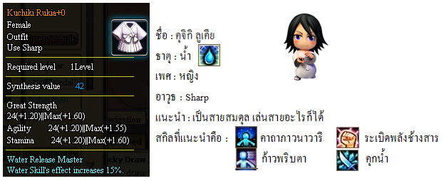 ประวัติ : ลูเคีย คุจิกิเป็นยมทูตหน่วย 13 แห่ง13หน่วยพิทักษ์ แต่เดิมเป็นเด็กสาวที่เติบโตจากเมืองลูคอนเร่ร่อนไปวันๆ ต่อมาได้มาเจอกับ อาบาราอิ เร็นจิโดยบังเอิญ เมื่อเพื่อนของพวกเขาเสียชีวิตไปถึงสามคน ลูเคียและ อาบาราอิ เร็นจิจึงตัดสินใจเข้าเรียนที่สถาบันชินโอเพื่อสอบเข้าหน่วยพิทักษ์ แต่ยังไม่ทันเรียนจบก็ได้รับการติดต่อให้เข้าเป็นคนของตระกูลคุจิกิ ตระกูลขุนนางชั้นสูงที่มีคุจิกิ เบียคุยะ หัวหน้าหน่วย 6 เป็นเจ้าบ้าน โดยเธอเองก็ได้รับการบรรจุเข้า 13 หน่วยพิทักษ ์หน่วยที่ 13 ในทันที