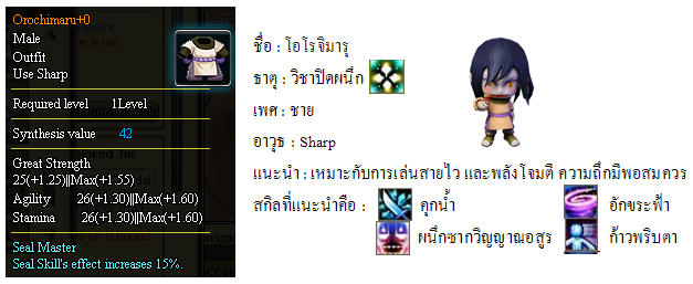 ประวัติ : ลูกศิษย์นอกคอกของซารุโทบิ นินจาในตำนาน ที่สามารถเรียกงูยักษ์ออกมาช่วยต่อสู้ได้ โอโรจิมารุ ใฝ่หาหนทางอมตะ จนอุทิศตัวให้กับวิชานอกรีต โดยจับนินจาของโคโนะฮะมาทดลองเป็นจำนวนมาก โดยจับมาผ่าตัดแยกชิ้นส่วนเพื่อศึกษาวิชา จนสามารถใช้วิชาย้ายร่างตัวเองไปสู่ร่างผู้อื่น ทำให้ตัวเองยังดูหนุ่มแน่นอยู่ตลอดแต่หากทำครั้งนึงแล้ว จะใช้วิชานี้ไม่ได้ไปอีก 3 ปี รวมไปถึงการปลุกชีวิตคนตายให้ฟื้นขึ้นมา และสามารถผ่าตัดแปลงโฉมใบหน้าได้ด้วย
