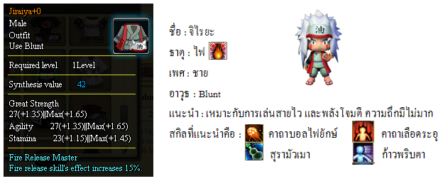 ประวัติ : ลูกศิษย์จอมโวของซารุโทบิ เป็นคนมุทะลุโผงผาง และ ทะลึ่ง แต่ก็เป็นนินจาในตำนานที่เก่งสุดๆ ขนาดลูกศิษย์เอก ยังเป็นถึงโฮคาเงะรุ่นที่ 4 เชียวนะ หลังจากโอโรจิมารุ แยกตัวออกจากโคโนะฮะ ซึนาเดะ ที่สูญเสียน้องชายและคนรักได้แยกตัวออกไป จิไรยะ ก็ใช้เวลาในการท่องเที่ยว และแต่งหนังสือนิยายรักวาบหวามเรื่อง อะจึ๊ย สวรรค์รำไร ที่ทำเอาหนุ่นๆนินจาติดกันงอมแงม โดยเฉพาะคาคาชิ ที่ต้องพกติดตัวไว้ตลอด