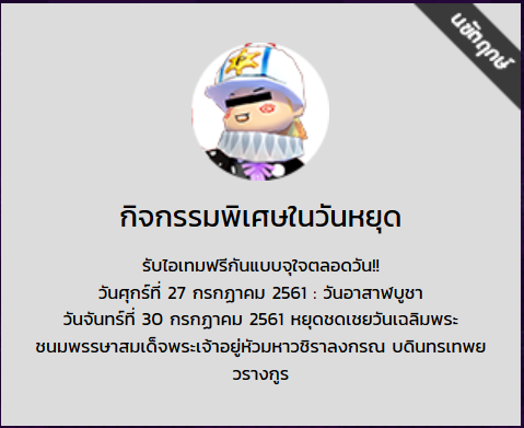 - • วันที่ 27 กรกฏาคม 2561 จัดกิจกรรมในเวลา 17.00-18.00น