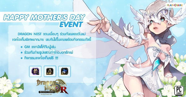 Dragon Nest ที่สุดแห่งเกม Action 3D MMORPG Dragon Nest R ขอร่วมเฉลิมฉลองวันแม่แห่งชาติ ด้วย กิจกรรม Dragon Nest Love Mom ซึ่งทาง GM ในเกม จะลงไปแจกบัฟให้กับผู้เล่นทุกคน และร่วมถ่ายภาพกับ GM โดยแสดงท่าทางหรือข้อความบอกรักแม่ พร้อมรับไอเทมฟรี ภายในวันอาทิตย์ที่ 12 สิงหาคม 2561 เวลา 19.00 – 20.00 และยัง มีกิจกรรมใน แฟจเพจ ถ่ายทอดความรู้สึกจากในเกมสู่นอกเกม แคปภาพที่ร่วมถ่ายกับ GM โดยแสดงท่าทางหรือข้อความบอกรักแม่ภายในเกม มาโพสต์ใต้กิจกรรมแฟนเพจ ลุ้นรับไอเทม ภายในวันที่ 12 – 13 สิงหาคม 2561 เท่านั้น สามารถติดตามรายละเอียดกิจกรรมในเกม Dragon Nest ได้ที่เพจ Dragon Nest Thailand