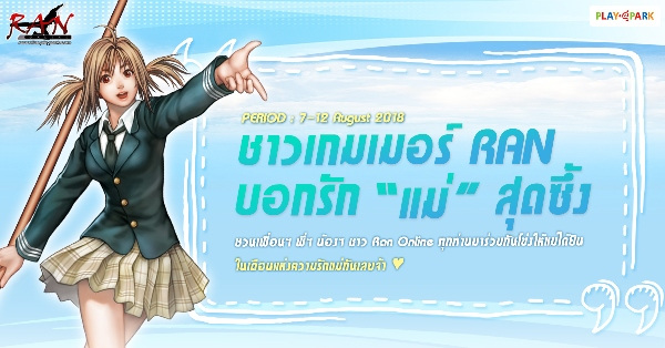 RAN Online สังเวียนเดือด ศึกสามสถาบัน ชวนพี่ๆน้องๆ ชาว RAN มาบอกรักแม่สุดซึ้ง กับภารกิจโข่งรักแม่ เชิญชวนเพื่อนๆ ทุกคนมาร่วมใจกันบอกรักแม่ ให่ครบ 9,999 ข้อความ เพื่อที่ภารกิจ จึงจะสำเร็จ โดยถ้าภารกิจสำเร็จ รับไอเทมยกเซิฟเวอร์ !! เริ่มแล้วตั้งแต่วันนี้ – 12 สิงหาคม 2561 เท่านั้น และ ในวันที่ 9 สิงหาคม เวลา 15.00 น. มีการแจกเสื้อรักแม่ ให้กับผู้เล่นทุกไอดี รายละเอียดเพิ่มเติม (คลิกที่นี่)