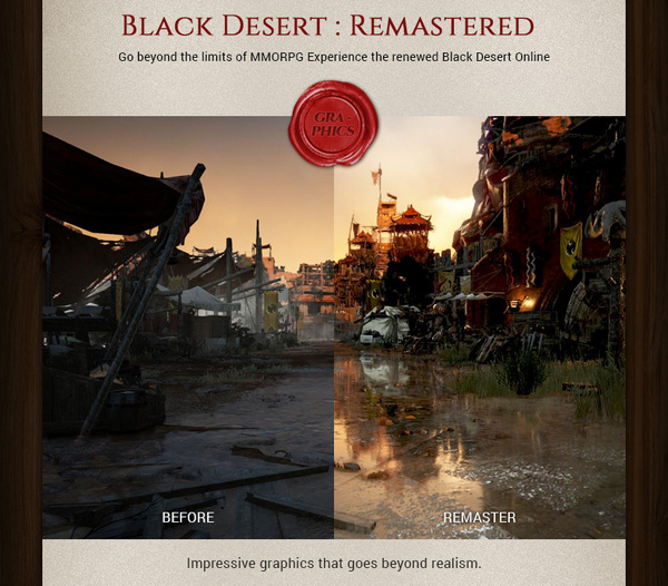บริษัท Pearl Abyss ได้ประกาศเพิ่มเติมว่า ในอนาคตนักผจญภัยจะได้เพลิดเพลินไปกับความคมชัดและความลื่นไหลของโลก Black Desert ด้วยการพัฒนาของระบบกราฟิกและการปรับปรุงระบบประมวลแสงและความคมชัดของภาพ ซึ่งทีมพัฒนาเกมยังคงทำงานอย่างต่อเนื่อง เพื่อเพิ่มประสิทธิภาพและก้าวข้ามข้อจำกัดของเกมที่เกิดขึ้นในระหว่างการรีมาสเตอร์