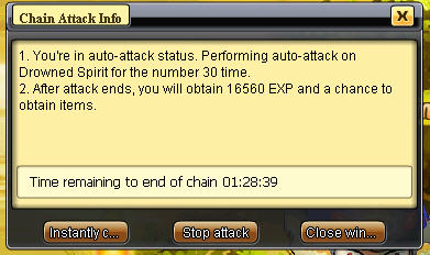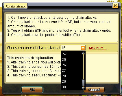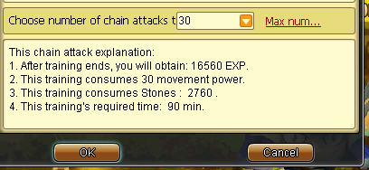 ส่วน Chain attack เมื่อกดแล้วจะพบหน้าต่างดังนี้ ซึ่งจะเลือกรอบต่อสู้ได้ทั้งหมด 1-30 รอบ โดยจะเสียค่า Movement 1 ต่อ 1 การต่อสู้เช่นกัน