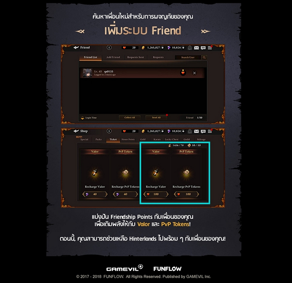 อันดับ 3 ได้แก่! การเพิ่มระบบ Freind เข้ามาเพื่อหาเพื่อนเล่น และแบ่งปันแต้ม Friendship Points กับเพื่อนๆ ของคุณ เพื่อใช้แต้มมิตรภาพเหล่านั้นเพิ่มพลังให้กับ valor และ PvP Tokens เพื่อเตรียมพร้อมที่จะปกปป้อง Hinterlands ไปพร้อมกับเพื่อนๆ ของคุณเล้ยยย!