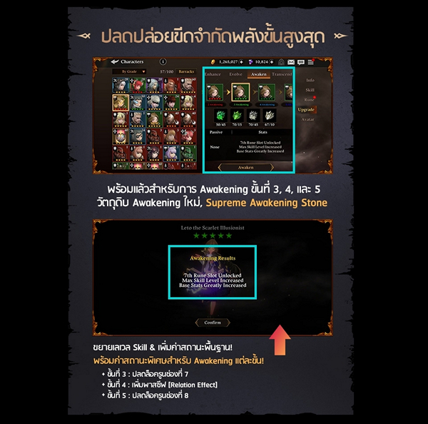 และที่สำคัญ! กับการปลดปล่อยขีดจำกัดพลังขั้นสูงสุด จากปกติ Awakening ได้ 2 ขั้น มาครั้งนี้ เราพร้อมเปิด! ปลดล็อคขีดจำกัดขั้นที่ 3, 4 และ 5 โดยใช้ Supreme Awakening Stone ที่จะดรอปจากดันเจี้ยนใหม่ ดันเจี้ยนที่ 11 นั่นเอง!