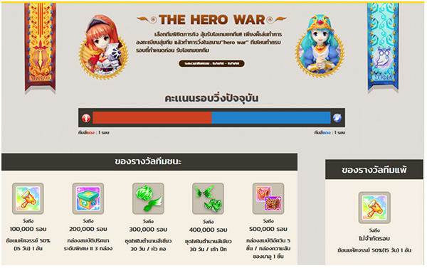 กิจกรรมนี้ผู้เล่นที่จะเข้าร่วมนั้นต้องมีเลเวลตั้งแต่ 29 ขึ้นไป โดยระบบจะสุ่มทีมสีแดง หรือ สีน้ำเงินให้กับผู้เล่น จากนั้นให้ผู้เล่นไปเก็บรอบวิ่งที่สนาม“The Hall of Opportunity’’ และ “Flag Battle’’ รอบวิ่งของผู้เล่นจะถูกสะสมรวมในปรอทของทีมที่สังกัด ทีมที่สะสมรอบวิ่งถึงที่กำหนดเป็นอันดับเเรกจะเป็นผู้ชนะ เเละได้รับของรางวัลพิเศษยกทีม ส่วนทีมที่แพ้ก็จะได้รับไอเทมปลอบใจไปแทน เมื่อจบกิจกรรมแล้ว ของรางวัลจะถูกส่งเข้าทาง Gift box หลังจากปิดปรับปรุงเซิร์ฟเวอร์ประจำสัปดาห์ โดยรอบวิ่งจะอัปเดตลง บนปรอท ทุกวันจันทร์, พุธ, ศุกร์ เวลา 08.00 น. ตั้งแต่วันนี้ไปจนจบกิจกรรม สามารถติดตามรายละเอียดเพิ่มเติมของกิจกรรมได้ที่ กิจกรรมThe Hero War