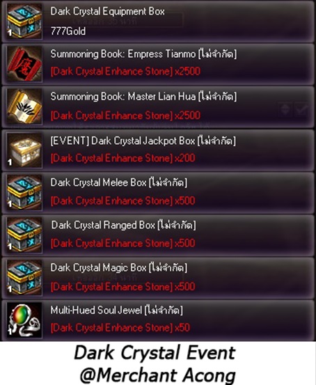 สำหรับกิจกรรมที่สอง “Dark Crystal Event” โดยเหล่านักรบที่มีเลเวล 60 ขึ้นไปนี้จะต้องมีกล่องอาวุธ Dark Crystal Equipment เสียก่อน แล้วจึงออกตามล่ามอนสเตอร์ Dark Invader ที่ปรากฎตามแผนที่ต่าง ๆ เพื่อล่า Dark Crystal Enhance Stone ซึ่งสามารถนำไปตีบวก เสริมความแข็งแกร่ง และยังนำไปแลกไอเทมได้ที่ Merchant Acong ได้อีกด้วย