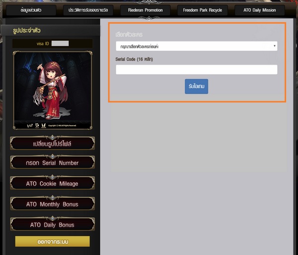 3. เลือกตัวละคร ใส่ Serial ด้านล่าง แล้วกดรับไอเทม