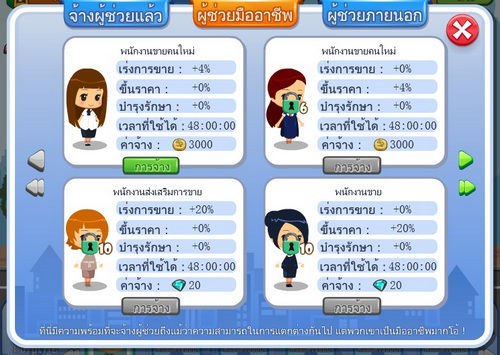 และที่สำคัญอีกอย่างยิ่งคือ เราต้องบริหารพนักงานในห้างของเราด้วย คือเราสามารถจ้างพนักงานเข้ามาประจำยังร้านต่างๆ ของเรา โดยพนักงานเหล่านี้ก็คือเพื่อนๆ ของเรานั้นเอง เราต้องหมั่นคอยเติมสินค้าให้พอดีกับห้างของเราด้วยนะครับ ไม่งานห้างเราจะขาดรายได้นะเออ ร้านค้าต่างๆ ของเราจะต้องหยุดขายไปจนกว่าจะมีสินค้าเข้ามาอีกครั้งนั้นเอง