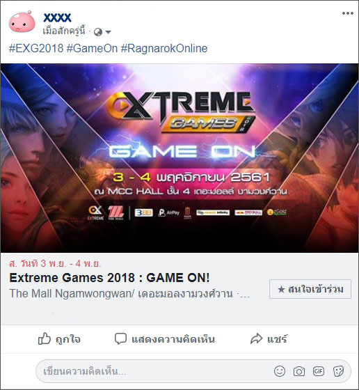 - ให้ผู้เล่นทำการกดแชร์โพสต์ Event งาน Extreme Games 2018 : Game On ตั้งค่าเป็น Public พร้อมติด Hashtag #EXG2018 #GameOn #RagnarokOnline