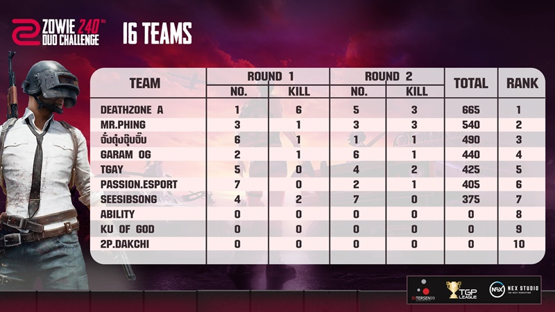 สรุปผลการแข่งขันรายการ ZOWIE 240 Hz DUO CHALLENGE รอบออนไลน์วันที่ 17 พ.ย. 2561 โดยรายชื่อ 6 ทีมที่สามารถผ่านเข้าสู่รอบ LAN FINAL ไปได้คือ