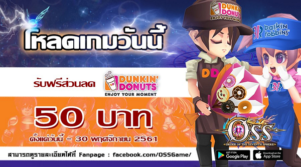 Hothead เอาใจคอเกมเมอร์แจกคูปองส่วนลด Dunkin’ Donuts 50 บาทฟรี! เพียงแค่ติดตั้งเกม “OSS : ศึกลูกแก้วเทพพิทักษ์โลก“ เล่นเกมเพลิน แถมยังได้อร่อยฟินๆ กับโดนัดแสนอร่อยตั้งแต่ วันนี้ – 30 พ.ย. 2561