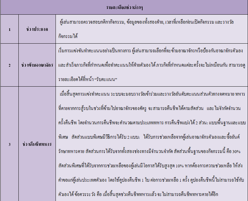 - ภารกิจโจมตีศัตรู นอกจากโจมตีคูเมืองแล้ว ช่องทางอื่นๆ จะมีขีดจำกัดการได้รับคะแนนทหารบาดเจ็บ