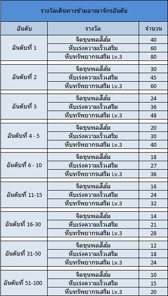 - รางวัลอันดับ: ระบบจะรวมคะแนนที่ผู้เล่นทั้งหมดที่ได้รับและทำการจัดอันดับ โดยผู้เล่นที่ติด 100 อันดับแรกจะได้รับรางวัล