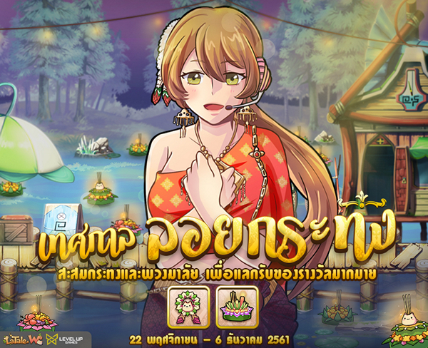 โดยกิจกรรมสุดสนุกครั้งนี้จะเป็นการเก็บสะสม “กระทงและพวงมาลัย” เพื่อนำไปแลกรับไอเทมสุดพิเศษมากมายที่พลาดไม่ได้เลย! ระยะเวลาร่วมสนุก 22 พฤศจิกายน – 6 ธันวาคมนี้! (ก่อนการปิดปรับปรุงเซิร์ฟเวอร์)