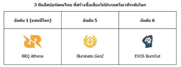 นอกจากนี้ยังมีตัวแทนทีมอีสปอร์ตคนไทยอีก 2 ทีม ได้แก่ ทีม Illuminate.GenZ และ ทีม EVOS BurnOut สามารถคว้าอันดับที่ 5 และ 6 ตามลำดับ โดยทีม Illuminate.GenZ จบอันดับ 5 สามารถทำคะแนนรวมได้ 3,560 คะแนน รับเงินรางวัล 8,000 เหรียญสหรัฐฯ (ราว 264,000 บาท) และทีม EVOS BurnOut จบอันดับ 6 ทำคะแนนรวมได้ 3,465 คะแนน รับเงินรางวัล 5,000 เหรียญสหรัฐฯ (ราว 165,000 บาท) สำหรับตารางอันดับและรายชื่อทีมผู้ชนะทั้ง 20 ทีม สามารถคลิกชมได้ที่ ลิงค์