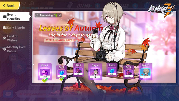 ล็อกอินครับ 7 วันในระว่างวันที่ 11 ธันวาคม ~ 25 ธันวาคม เพื่อรับคริสตัล และสติกมา Rita: Autumn Leaves (ล่าง)!