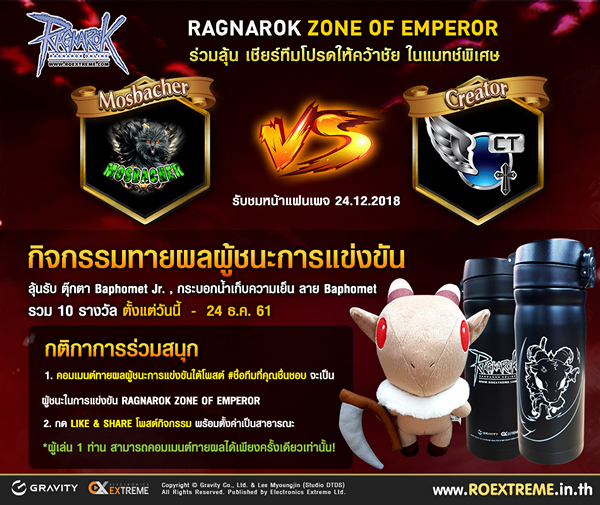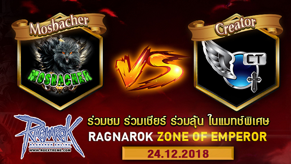 กลับมาอีกครั้งกับศึกการแข่งขันรอบพิเศษ RAGNAROK ZONE OF EMPEROR 56 vs 56 การปะทะกันระหว่าง Mosbacher และ Creator ซึ่งจะระเบิดศึกการแข่งขันในวันจันทร์ที่ 24 ธันวาคมนี้! และทีมงานก็มีกิจกรรมให้ร่วมสนุกกันอีกแล้ว กับการทายผลผู้ชนะการแข่งขันในศึกครั้งนี้ กติการ่วมสนุกก็ง่ายมากๆ เพียงเข้าไปคอมเมนต์ทายผลผู้ชนะการแข่งขันใต้โพสต์กิจกรรมที่ Facebook Fanpage : Ragnarok Online Thailand ก็ลุ้นรับของรางวัลพรีเมี่ยมสุดน่ารักน่าสะสมไปเลย! แจกทั้งสิ้น 10 รางวัล ร่วมสนุกทายผลกัน ได้ตั้งแต่ วันนี้ – 24 ธันวาคม 2561 เวลา 12.00 น.