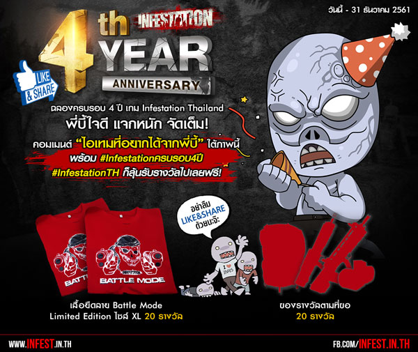 ฉลองครบรอบ 4 ปี เกม Infestation Thailand พี่บี้ใจดี แจกหนักจัดเต็ม กติกาง่ายๆเพียงกด Like&Share ภาพกิจกรรมบนหน้าแฟนเพจ Infestation Thailand และ Comment ใต้ภาพระบุ “ไอเทมที่อยากได้จากพี่บี้” และใส่ Hashtag #Infestationครบรอบ4ปี #InfestationTH ก็ลุ้นเป็น 40 ผู้โชคดี รับเสื้อ Battle Mode Limited Edition สีแดงสุดเท่ ไซส์ XL จำนวน 20 รางวัล! มาพร้อมกับของรางวัล Lucky Draw สุดพิเศษ แจกไอเทมในเกมตามที่ขอฟรี! อีก 20 รางวัล รวม 40 รางวัล!!