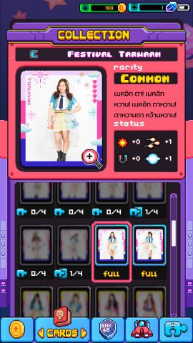 สำหรับการ์ดเมมเบอร์แต่ละคนจะมีด้วยกัน 3 รูปแบบ ได้แก่ เต็มตัว ครึ่งตัว และโคลสอัพ และยังถูกแบ่งตามระดับความแรร์ตั้งแต่ Common >Rare >Super Rare อีกด้วย โดยแต่ละใบจะมีความในการนับสนุนต่างๆกัน ทั้งเพิ่มความเสียหาย ,แม่เหล็ก(รัศมีในการดูดเหรียญ) , อัตราการยิง ,เกจไม้ตาย เป็นต้น