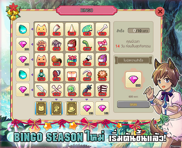 เมื่อผู้เล่นทำการจำกัดมอนสเตอร์ก็จะได้ชิ้นส่วนไอเทมสำหรับประกอบในกระดาน Bingo ที่ต่างกันออกไป และเมื่อออกตามล่าชิ้นส่วน Bingo ที่หายไปจนครบ ก็สามารถนำไปแลกเพื่อรับของรางวัลสะสมมากมาย อาทิเช่น Gem of Skill Point ,บัตรเครื่องแต่งกาย ,บัตรสุ่มสัตว์เลี้ยง และ “เพชรชมพู” มากกว่า 1,600 เพชร เลยทีเดียว!!