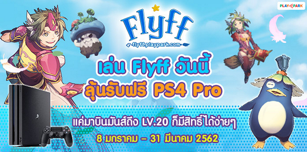 กิจกรรม “เล่น Flyff วันนี้ลุ้นรับฟรี PS4 Pro” สำหรับผู้เล่น Flyff ทุกคน ทั้งผู้ที่พบภาพโฆษณา และผู้ที่รักเกม Flyff อยู่แล้ว ก็เข้าร่วมสนุกง่ายๆ เพียงแค่ลงทะเบียนเข้าร่วมกิจกรรม และเก็บเลเวลให้ถึง 20 ก็มีสิทธิ์โชคดีได้เป็นเจ้าของ Play Station 4 Pro ทันที!! ระยะเวลากิจกรรม 8 มกราคม – 31 มีนาคม 2562 เพิ่มเติมคลิก!