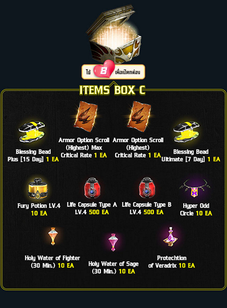 - เมื่อสะสมแต้มเพื่อแลกกล่องสุ่มได้แล้วสามารถสุ่มรับไอเทมที่อยู่ภายในกล่องได้เลย โดยไอเทมจะถูกส่งไปยัง Cash Inventory ภายในเกมทันที