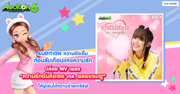 AUDITION เกมแดนซ์ออนไลน์สุดฮิตอันดับ 1 ของเมืองไทย จาก PlayPark.com ขอเพิ่มดีกรีความหวานในเดือนแห่งความรัก ด้วย MV เพลง “ความรักฉันคือเธอ” เวอร์ชั่นใหม่ล่าสุด โดยได้ศิลปินสาวมากความสามารถ การันตีความฮอตด้วยยอดชมร้อยล้านวิวอย่าง “พลอยชมพู (Jannine Weigel)” มาปล่อยพลังเสียง และร่วมเล่น MV เพิ่มดีกรีให้ MV นี้เต็มไปด้วยความหวาน ความสดใส รับรองว่าชม MV กี่ครั้ง ฟังเพลงกี่หน ก็ยังฟินนนน~ สำหรับเพื่อนๆ คนไหนที่พลาดยังไม่ได้ชมสามารถคลิกชมได้เลย