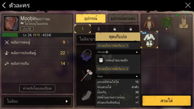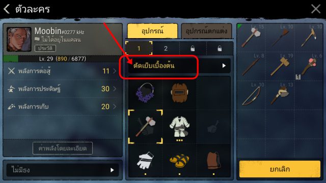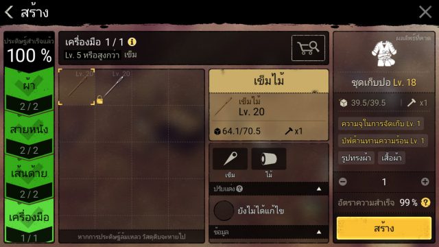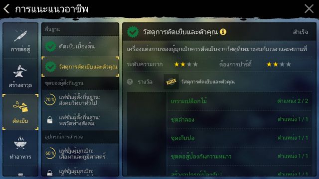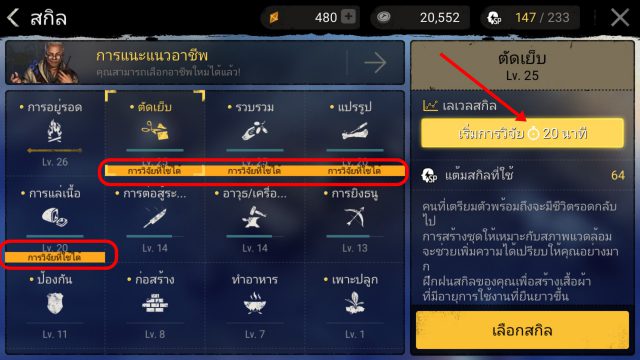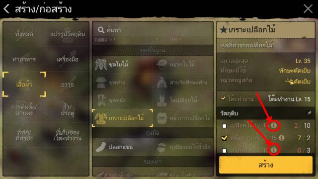 เช็คไอเทมที่จะคราฟจะสกิล เช่น สายตัดเย็บ ต้องการทำชุดเกราะ LV 25 [เกราะเปลือกไม้] เมื่ออัพสกิลนี้แล้ว ให้ไปดูว่าการสร้างของชิ้นนี้ใช้อะไรบ้าง โดยจะใช้ 3 อย่างดังนี้ [เปลือกไม้ ,หนังตากแห้ง ,เชือกฟาง] สำหรับเปลือกไม้ต้องอัพสกิลแปรรูป[เปลือกไม้] [หนังตากแห้ง]ต้องอัพสกิลถลกหนังของแล่เนื้อ และสกิลแปรรูปหนังตากแห้ง ก็ให้เลือกอัพเฉพาะที่ต้องใช้พอ อย่างอื่นเก็บไว้ก่อน แต่หากวัตถุดิบนั้นระดับสูงเกินไปเช่น แร่เหล็กที่ต้องใช้ SP จำนวนมากในการอัพสกิล ให้ซื้อเอาจะดีกว่า สำหรับใครที่งงว่าขาดของอะไร สกิลอะไร ให้กดตรงเครื่องหมาย ! เพื่อแสดงเงื่อนไขว่า ยังขาดวัสดุอะไรหรือสกิลอะไร จะซื้อจากตลาดหรือสร้างวัสดุเอง(กรณีที่สร้างได้)