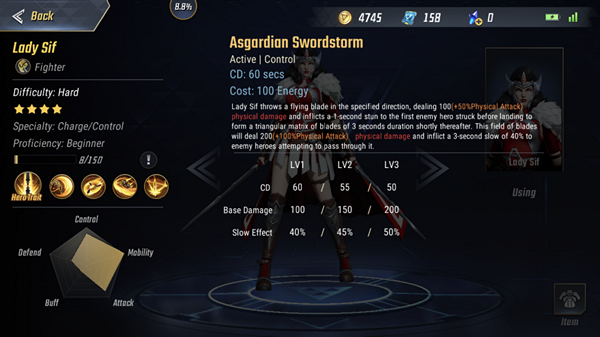 Asgardian Swordstorm เมื่อใช้สกิลนี้ Lady Sif จะขว้างดาบไปในทิศทางที่กำหนดทำเดเมจแก่ฮีโร่ศัตรูคนแรกที่โดน 100 + (50% ของพลังโจมตีกายภาพ) พร้อมทั้งสตันท์ฮีโร่คนนั้น 1 วินาที และ สร้างอาณาเขต สามเหลี่ยมแห่งดาบ รอบฮีโร่คนนั้นเป็นเวลา 3 วินาที ฮีโร่ที่เข้ามาในอาณาเขตแห่งนี้จะโดนเดเมจ 1 ครั้งความแรง 200 +(100% ของพลังโจมตีกายภาพ) และ ถูกทำให้ช้าลง 40%