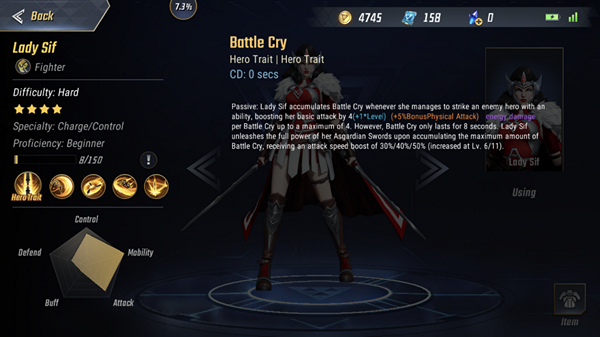 Battle Cry ความสามารถติดตัวของ Lady Sif เมื่อเธอโจมตีฮีโร่ฝั่งตรงข้ามโดนด้วย สกิล ใดก็ตามเธอจะเพิ่มพลังโจมตีปรกติ เท่ากับ 4(1*Level)+(5% ของโบนัสพลังโจมตี) เป็นเวลา 8 วินาที เมื่อเธอเพิ่มพลังจนถึงขีดสุดดาบของเธอจะเปลี่ยนสู่รูปร่างที่แท้จริง ซึ่งปรกติจะเป็นดาบสั้น แต่เมื่อเข้าสู่โหมดนี้ดาบทั้งสองเล่มจะถูกนำมาต่อกัน และ ทำให้ความเร็วโจมตีของ Lady Sif เพิ่มขึ้น 30% / 40% / 50% ตามระดับเลเวลตัวละคร