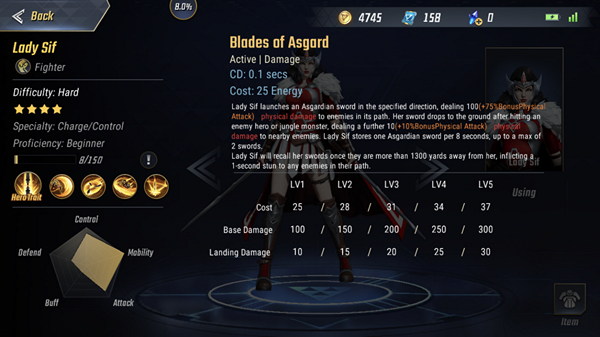 Blade of Asgard เมื่อใช้สกิลนี้ Lady Sif จะขว้างดาบออกไปยังทิศทางที่กำหนดศัตรูที่อยู่ในเส้นทางของดาบจะโดนเดเมจ 100 + (75% ของโบนัสเดเมจ) ซึ่งค่าเดเมจพื้นฐานจะเพิ่มขึ้นตามเลเวลของสกิล หากดาบที่ขว้างออกไปโดนฮีโร่ หรือ ครีปป่า ดาบจะตกสู่พื้นทันทีพร้อมทั้งทำเดเมจได้อีกเล็กน้อย ดาบที่ตกสู่พื้นจะกลับสู่มือของ Lady Sif เมื่อเวลาผ่านไป 8 วินาที หรือ Lady Sif อยู่ห่างจากดาบเกิน 1300 ระหว่างที่ดาบลอยกลับมาหากโดนศัตรูจะทำให้สตันท์ 1 วินาที
