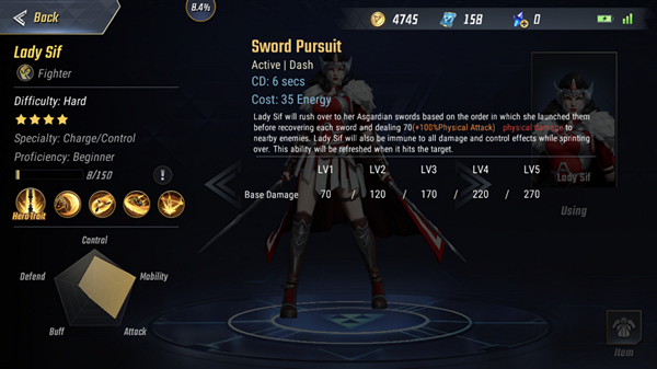 Sword Pursuit เมื่อใช้สกิลนี้ Lady Sif กระโดดไปหาดาบที่ปักอยู่บนพื้น ตามลำดับที่เราขว้างดาบไว้เมื่อไปถึงดาบแต่ละเล่มเธอจะหยิบดาบขึ้นมากวาดรอบตัวทำเดเมจ 70 +(100% ของพลังโจมตีกายภาพ) ค่าเดเมจพื้นฐานจะเพิ่มขึ้นตามเลเวลของสกิล เมื่อศัตรูโดนเดเมจจากสกิลนี้จะรีเซ็ตคูลดาวน์ของสกิลทันที ในระหว่างที่เธอกระโดดด้วยสกิลนี้เธอจะไม่รับทั้งเดเมจ และ ผลของทุกสกิล จนกว่าจะกระโดดถึงเป้าหมาย