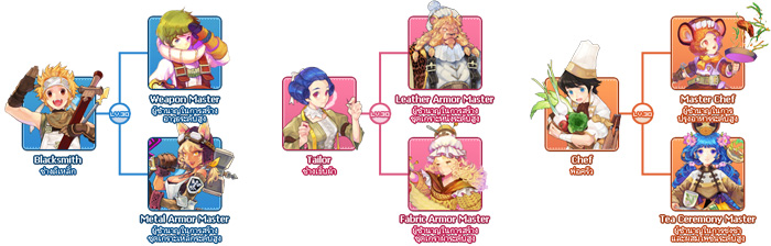 เมื่อตัวละครมีทักษะสร้างไอเท็มที่เพียงพอแล้ว สามารถเลือกสายการพัฒนาเฉพาะด้านไปสู่ระดับขั้น 2 ได้ เช่น Chef สามารถเลือกเป็นเชฟปรุงอาหาร หรือผู้ชำนาญการชงเครื่องดื่มก็ได้ สำหรับ Tailor ก็เลือกการตัดเย็บเสื้อผ้าจากหนัง หรือผ้า แม้แต่ช่างโลหะก็เลือกสร้างอาวุธ หรือชุดเกราะ เป็นต้น