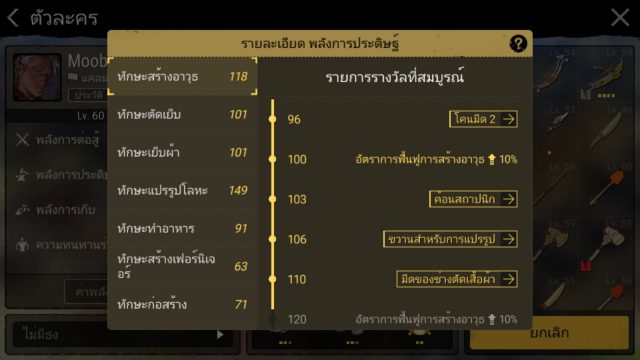 * หมายเหตุ : สำหรับการประดิษฐ์ไอเทมตามเควส จำเป็นจะต้องใส่ชุดสร้างตามสาย เช่นหัตกรรม ,ก่อสร้าง ,ตัดเย็บ แลกินอาหาร เพื่อให้แต้มการประดิษฐ์ถึงตามที่กำหนด จึงจะประดิษฐ์สิ่งต่างๆได้ สามารถดูได้จาก เมนู>ตัวละคร>พลังการประดิษฐ์