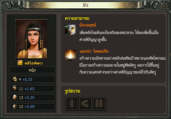 คลีโอพัตรา: เป็นฮีโร่ที่เหมาะแก่การบัญชาการกองทัพทหารราบ, พลธนู หรือ ทหารม้า