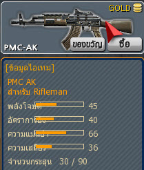เรียกง่ายๆ ว่าปืน AK เป็นปืนที่หลายคนต้องชอบแน่นอนเพราะว่าทั้งพลังโจมตีของปืนถึง 45 และด้วยแรงดีดของปืนที่รุนแรงจึงทำให้ปืน AK ต้องยิงทีละ 3 นัด และเพียงแค่ 3 นัดก็สามารถปลิดชีพศัตรูที่อยู่ต่อหน้าจะมีกล้องซูมให้ด้วย (คลิกขวา)