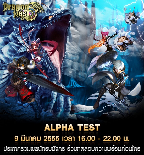 ข่าวดีสำหรับแฟนๆ Dragon Nest ประกาศรวมพลนักรบมังกร!! ทดสอบความพร้อมก่อนใคร โดยจะเปิดให้ทดสอบเล่นช่วง Alpha Test ในวันที่ 9 มีนาคม 2555 นี้ ตั้งแต่เวลา 16.00 – 22.00 น.