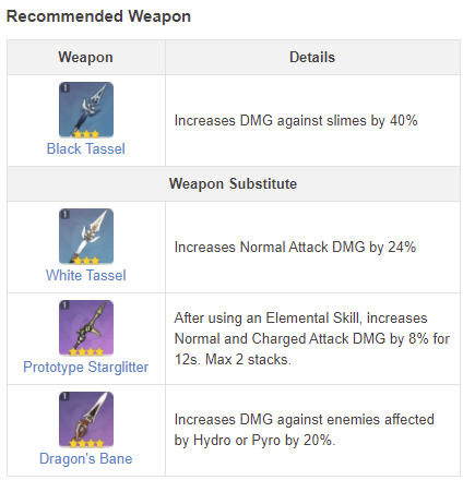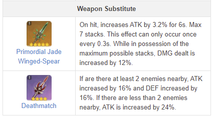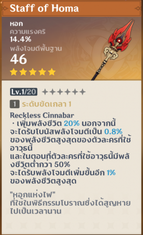 1.) Staff of Homa – เลือดจะฟื้นให้ 20% และเพิ่มโบนัสดาเมจให้กับเลือดสูงสุดของผู้ใช้ 0.8% และหากเจ้าของที่ถือเลือดน้อยกว่า 50% ก็จะแรงขึ้นอีก 1% เรียกได้ว่าเป็นอาวุธของ Hu Tao เพื่อ Hu Tao โดยเฉพาะ