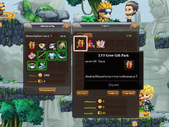 นอกจากเนื้อเรื่องที่ดำเนินตามเรื่องราวของการ์ตูนแล้ว Bubble Ninja ยังมีคอสตูมให้ผู้เล่นได้สวมใส่เพลิดเพลินไปกับการเล่น ซึ่งคอสตูมนั้นช่วงแรกๆ จะได้จากกล่องของรางวัล Lv.5 Grow Gift Pack หรือกล่องของขวัญที่ติดตัวมาตั้งแต่ตอนสร้างตัวละคร สามารถเปิดได้ที่เลเวล 5