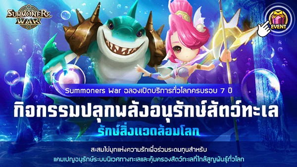 Com2uS จัดแคมเปญ เชิญชวนผู้เล่นทั่วโลกปกป้องสัตว์ทะเลใกล้สูญพันธุ์กับแคมเปญอนุรักษ์สิ่งแวดล้อม แค่ทำภารกิจในเกม Summoners War ก็สามารถร่วมได้แล้ว! โครงการอนุรักษ์สิ่งแวดล้อมเพื่อเฉลิมฉลองการ เปิดบริการทั่วโลกครบรอบ 7 ปี ของ Summoners War เพียงเข้าร่วมกิจกรรมเพื่อให้เหล่าสัตว์ทะเลซึ่งถูกคุกคามจากการทำลายสิ่งแวดล้อมที่เกิดจากพลาสติกและขยะต่างๆ ได้มีสถานที่อยู่อาศัยที่ปลอดภัยและสะดวกสบาย เช่นเดียวกับมอนสเตอร์ที่อาศัยอยู่บนเกาะลอยฟ้า โครงการนี้ได้รับความร่วมมือกับ Korea Green Foundation ซึ่งเป็นองค์กรพัฒนาเอกชน (NGO) ด้านการอนุรักษ์สิ่งแวดล้อม รายละเอียดการเข้าร่วมเป็นอย่างไรมาดูกันเลยค่ะ!