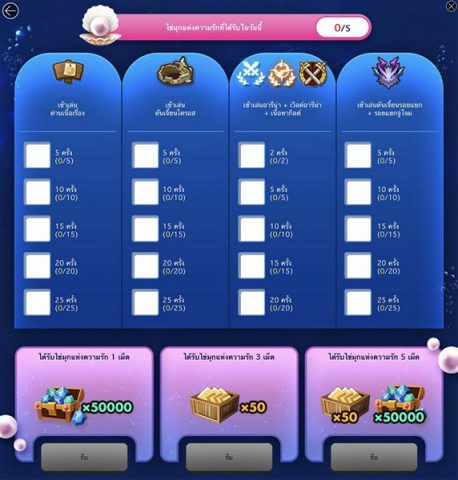พิชิตภารกิจให้สำเร็จทุกวัน แล้วสะสม [ไข่มุกแห่งความรัก] ทีละ 1 เม็ด เพื่อร่วมปกป้องสัตว์ทะเลใกล้สูญพันธุ์ คุณจะได้รับของขวัญรายวันเมื่อสะสมไข่มุกแห่งความรักครบทุก [1 เม็ด / 3 เม็ด / 5 เม็ด]!
