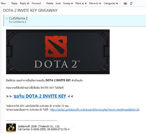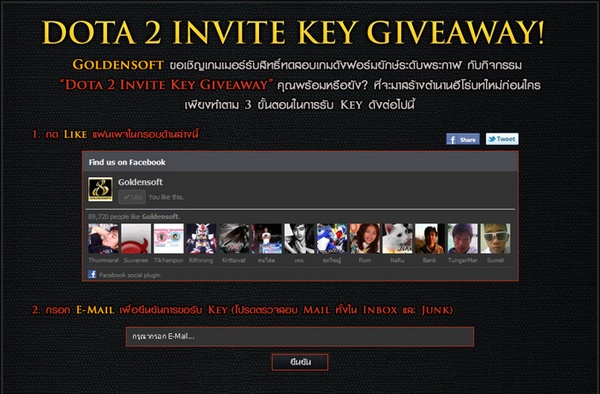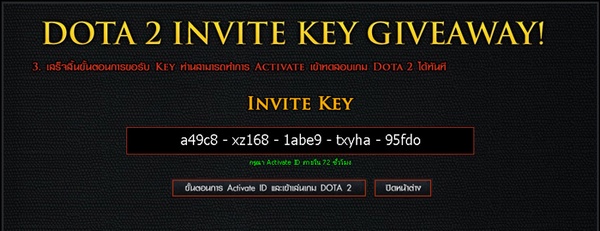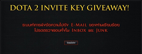 พร้อมกันนี้ ยังมีข่าวดีสำหรับผู้ที่ยังไม่มี DOTA 2 INVITE KEY เพราะวันนี้เกม DOTA 2 เปิดเทศกาลรับ KEY ให้เหล่าเกมเมอร์ไทยที่สนใจร่วมทดสอบเกมในตำนาน ซึ่งกำลังนับถอยหลังสู่การเปิดตัวเต็มรูปแบบในประเทศไทยในอีกไม่นานนี้แล้วค่ะ เอาล่ะ อย่ามัวรอช้า เตรียมตัวเตรียมใจ และที่สำคัญ “อีเมล” ของคุณไว้ให้พร้อม แล้วรีบลงมือทำตามขั้นตอนง่ายๆ ข้างล่างนี้เท่านั้น รับฟรีกันไปเลย